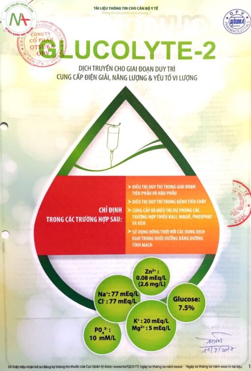 Thuốc Glucolyte-2 là thuốc dùng trong tiêm truyền tĩnh mạch, với các hoạt chất là Zinc Sulfat.7H2O, Monobasic Potassium Phosphate, Sodium acetate.3H2O, Magnesium Sulfate, Potassium chloride, Sodium chloride, Dextrose anhydrous.