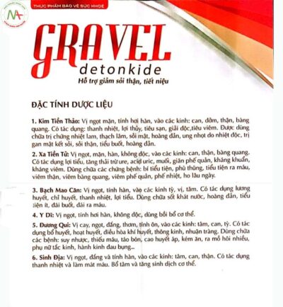 Gravel Detonkide là sản phẩm có nguồn gốc từ các thảo dược tự nhiên, nó được biết đến với công dụng trong việc lợi tiểu, hỗ trợ làm giảm sỏi mật, sỏi tiết niệu.