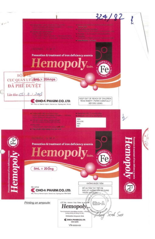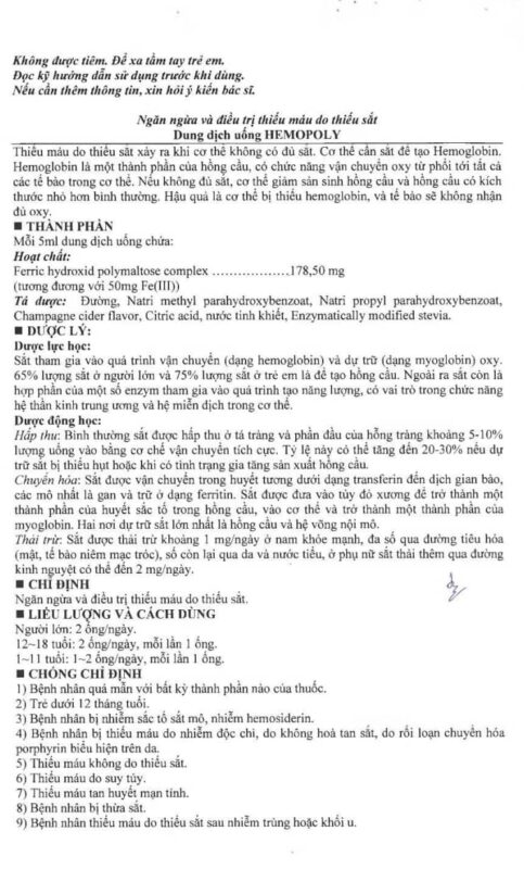 Thuốc Hemopoly 5ml là một loại thuốc không kê đơn – một dung dịch uống bổ sung sắt có hoạt chất chính là phức hợp Sắt (III) hydroxid polymaltose có công dụng ngăn ngừa, điều trị thiếu máu do thiếu sắt và thiếu máu do những nguyên nhân tiềm ẩn khác.