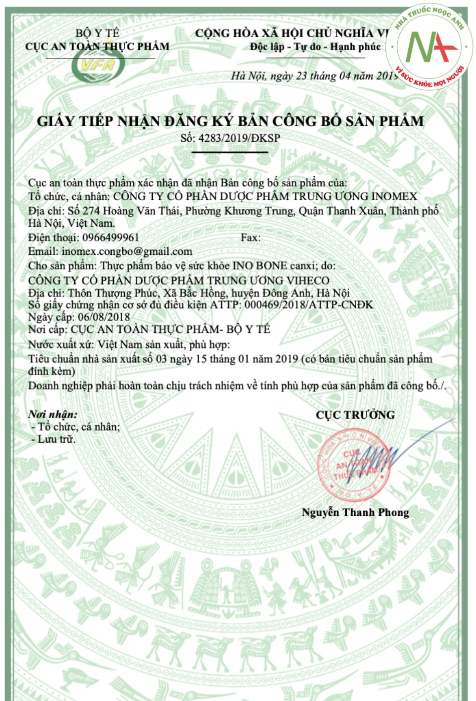 - Ino Bone Canxi đã được Bộ y tế cấp phép lưu hành, vì vậy người tiêu dùng có thể dễ dàng mua được tại các hiệu thuốc trên toàn quốc.