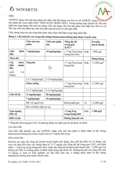 - Cần theo dõi nồng độ ferritin huyế thanh mỗi tháng để có thể điều chỉnh liều Jadenu hợp lý. Thường thì mỗi 3 đến 6 tháng sẽ điều chỉnh liều 3,5-7 mg/kg tùy theo đáp ứng và mục tiêu điều trị.