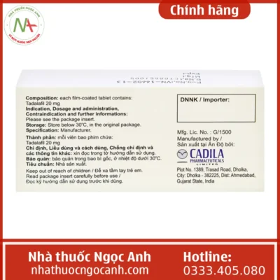 - Hoạt chất: Tadalafil hàm lượng 20mg