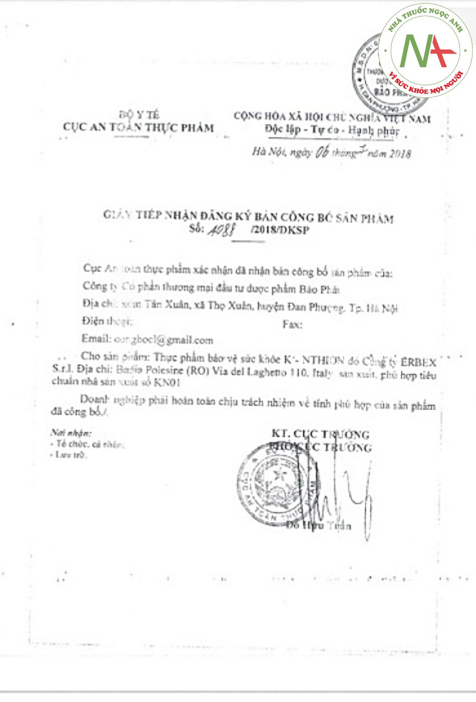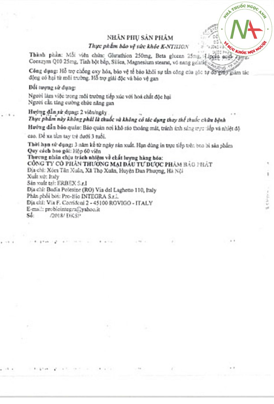 - K-Nthion là sản phẩm thuộc công ty Pro-Bio Pharma, một trong những hãng dược uy tín và hàng đầu tại Ý, chuyên sản xuất các thuốc và thực phẩm chức năng chăm sóc sức khoẻ người dùng.