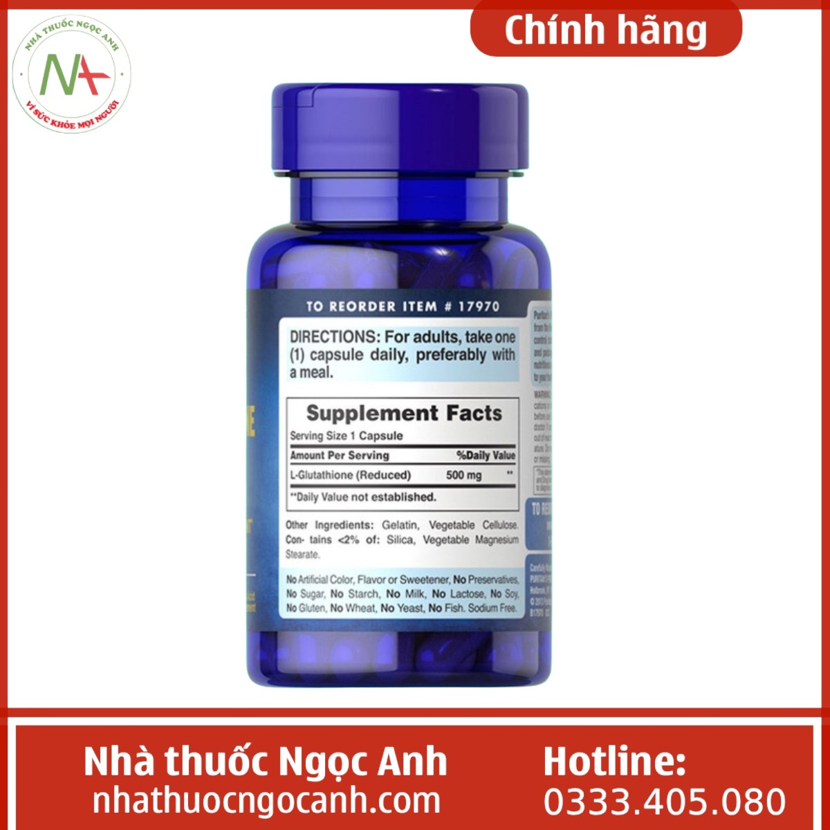 Trong 1 viên nang L-Glutathion Reduced 500mg Puritan’s Pride có chứa các thành phần với hàm lượng như sau: