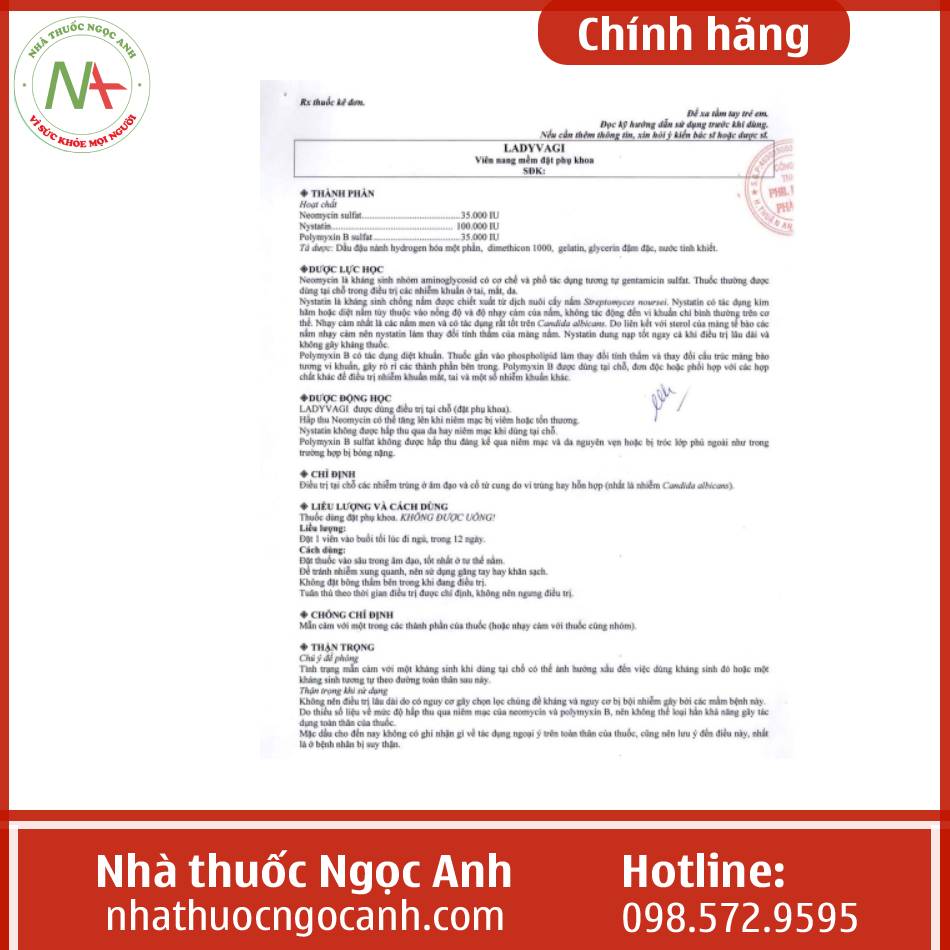 Ladyvagi là thuốc đặt âm đạo có thành phần hoạt chất chính là Neomycin sulfat 35.000 IU, Nystatin 100.000 IU, Polymyxin B sulfat 35.000 IU, thuốc có tác dụng điều trị viêm âm đạo do các vi khuẩn nhạy cảm và nhiễm trùng cổ tử cung.