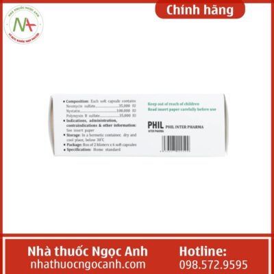 Thành phần hoạt chất: Neomycin sulfat 35.000 IU, Nystatin 100.000 IU, Polymyxin B sulfate 35.000 IU.