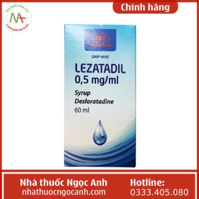 Thuốc Lezatadil 0,5mg/ml có chứa thành phần chính là Desloratadin. Thuốc có công dụng điều trị viêm mũi dị ứng, giảm các triệu chứng mẩn ngứa, phát ban do mày đay. Thuốc được bào chế dưới dạng siro, sản xuất bởi công ty Công ty cổ phần dược phẩm và sinh học y tế Mebiphar, được cục quản lý dược Việt Nam cấp phép lưu hành với số đăng ký VD-30067-18.