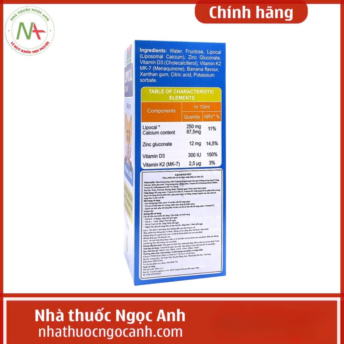 Siro Lipocal K2-MK7 có thành phần chính bao gồm: