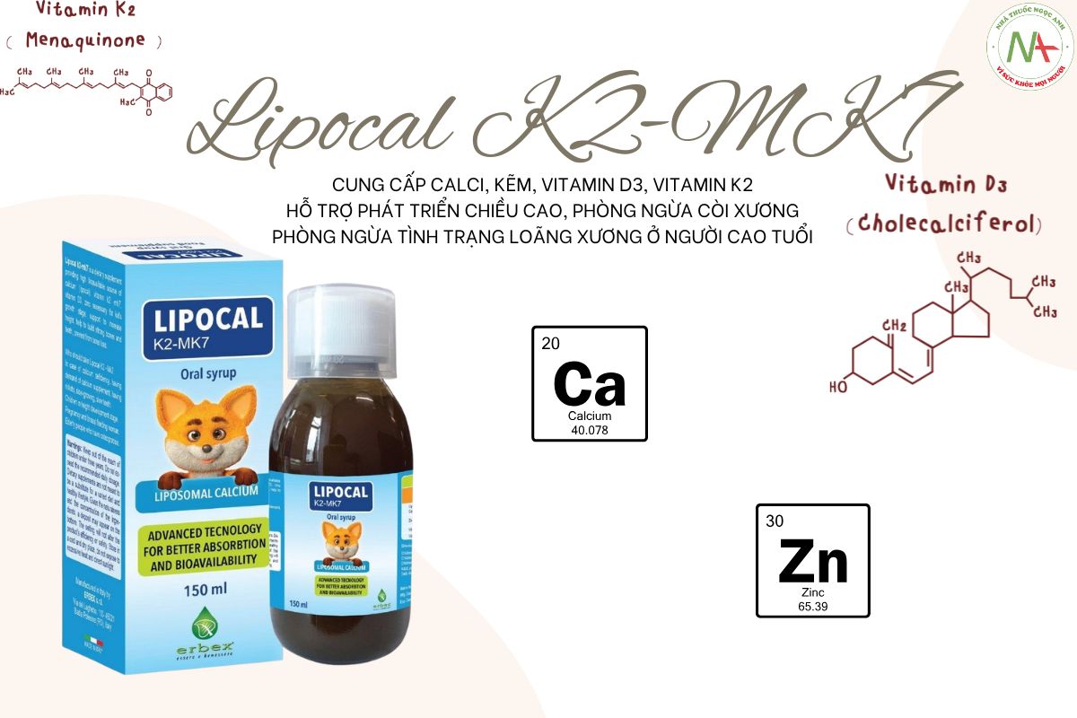 Lipocal K2-MK7 giúp bổ sung các khoáng chất và vitamin cần thiết giúp thúc đẩy quá trình phát triển của trẻ nhỏ đang trong giai đoạn phát triển, phòng ngừa nguy cơ còi xương suy dinh dưỡng ở trẻ em, phòng ngừa nguy cơ loãng xương ở người cao tuổi, phụ nữ đang mang thai và đang nuôi con bằng sữa mẹ