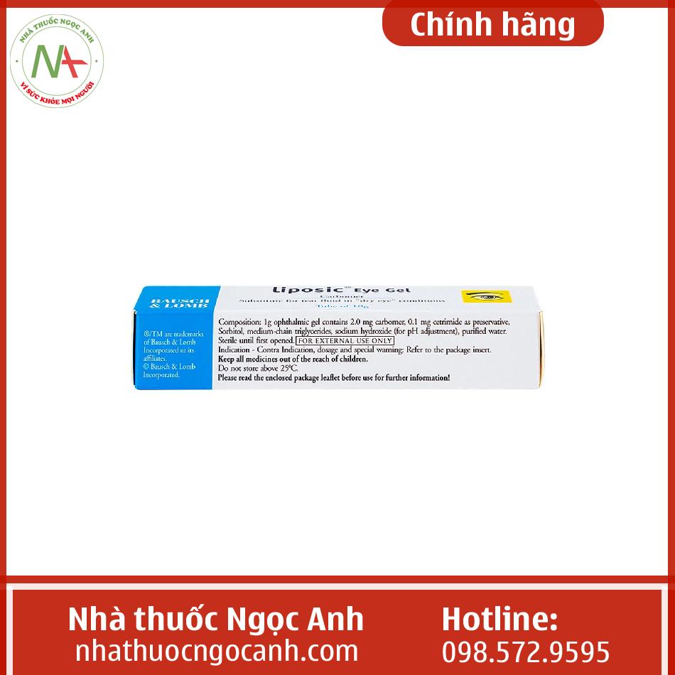 Mỗi tuýp Liposic Eye Gel 10g có chứa hoạt chất chính là Carbomer 20mg và các loại tá dược khác vừa đủ 1 tuýp.