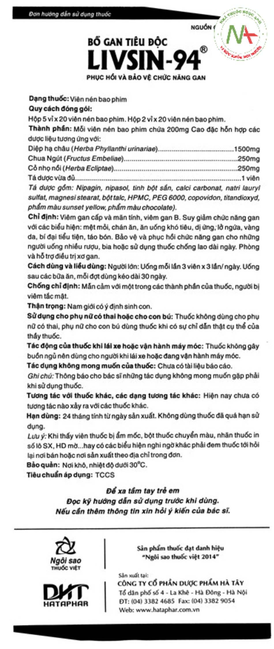 - Bổ gan tiêu độc Livsin-94 được nghiên cứu bởi những chuyên gia hàng đầu trong ngành y dược và được sản xuất tại nhà máy đạt tiêu chuẩn GMP-WHO, của công ty Công ty cổ phần dược phẩm Hà Tây.