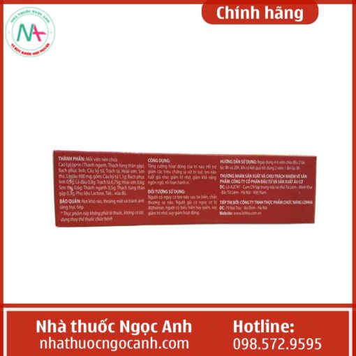 - Ngoài ra trong sản phẩm còn có chứa cao Lá dâu 0,8g và cao Sơn thù 0,6g giúp hỗ trợ giảm thiểu các biểu hiện của căn bệnh Alzheimer hiệu quả.