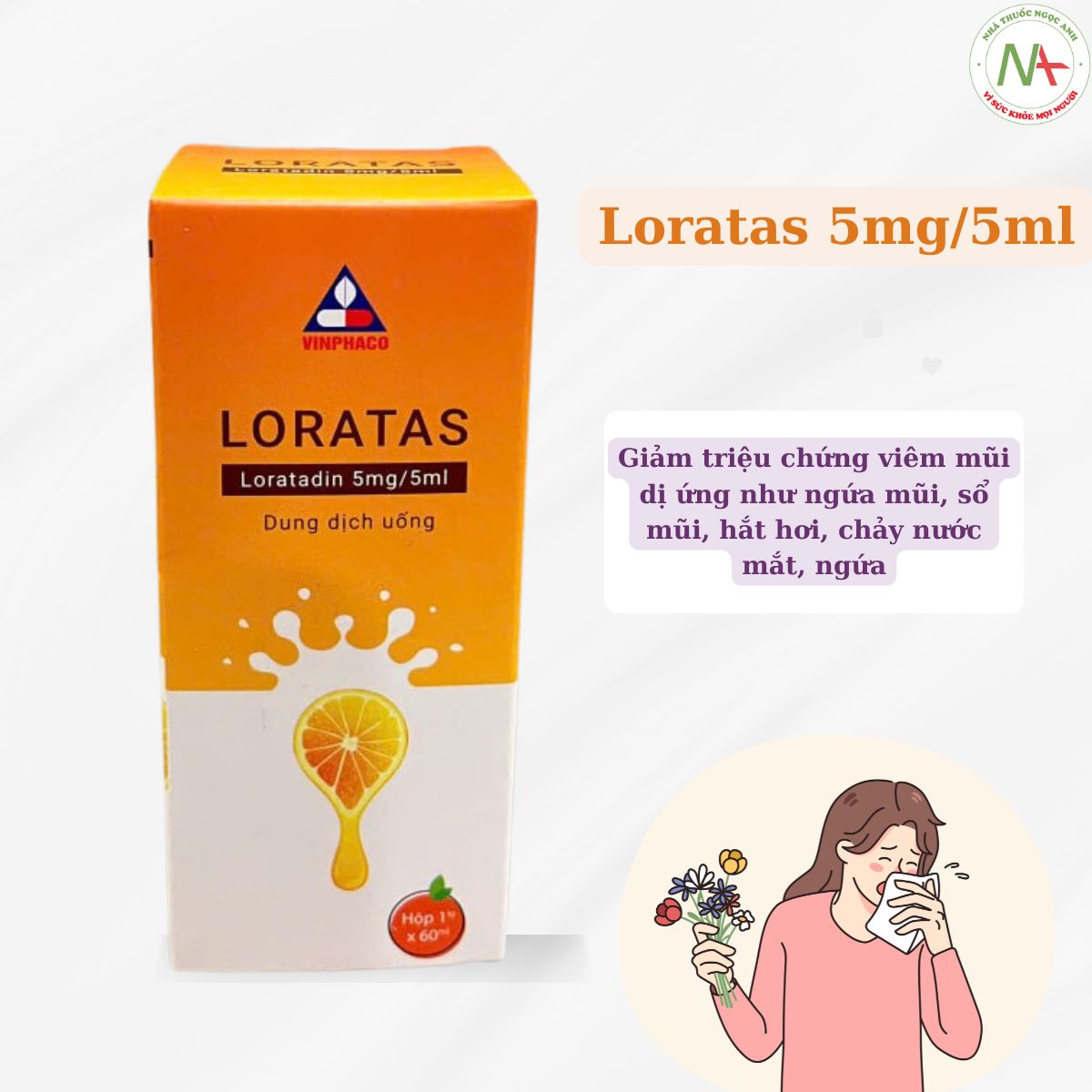 Loratas 5mg/5ml có tác dụng giảm triệu chứng viêm mũi dị ứng như ngứa mũi, sổ mũi, hắt hơi, chảy nước mắt, ngứa.