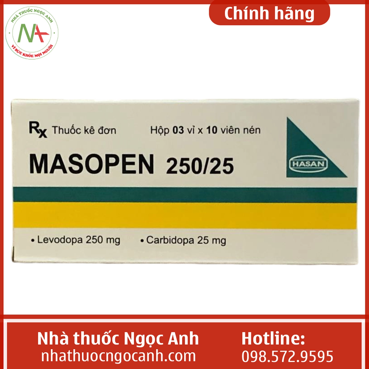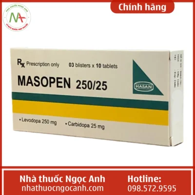 Thuốc Masopen 250/25 là thuốc có chứa các thành phần dược chất Levodopa, carbidopa, có tác dụng điều trị các chứng bệnh parkinson hay một số hội chứng bệnh về não