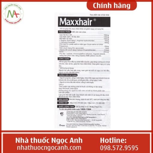Maxxhair được đóng gói thành hộp gồm 3 vỉ, mỗi vỉ gồm 10 viên nén bao phim.