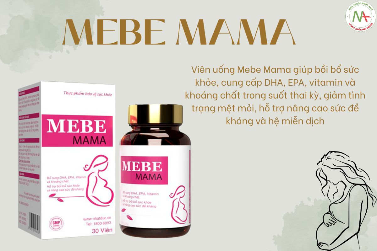 Viên uống Mebe Mama giúp bồi bổ sức khỏe, cung cấp DHA, EPA, vitamin và khoáng chất trong suốt thai kỳ, giảm tình trạng mệt mỏi, hỗ trợ nâng cao sức đề kháng và hệ miễn dịch.