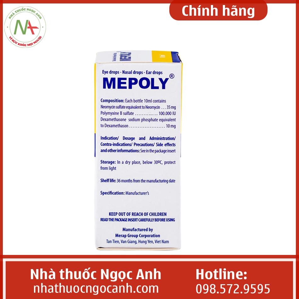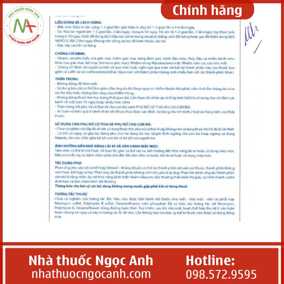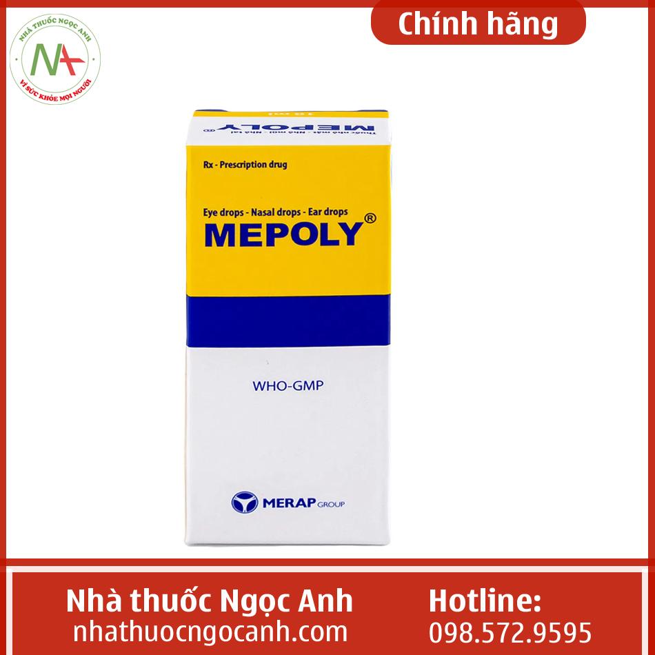 Thuốc nhỏ mắt Mepoly kết hợp kháng sinh và chống viêm sử dụng trong các trường hợp nhiễm khuẩn mắt, mũi, tai.