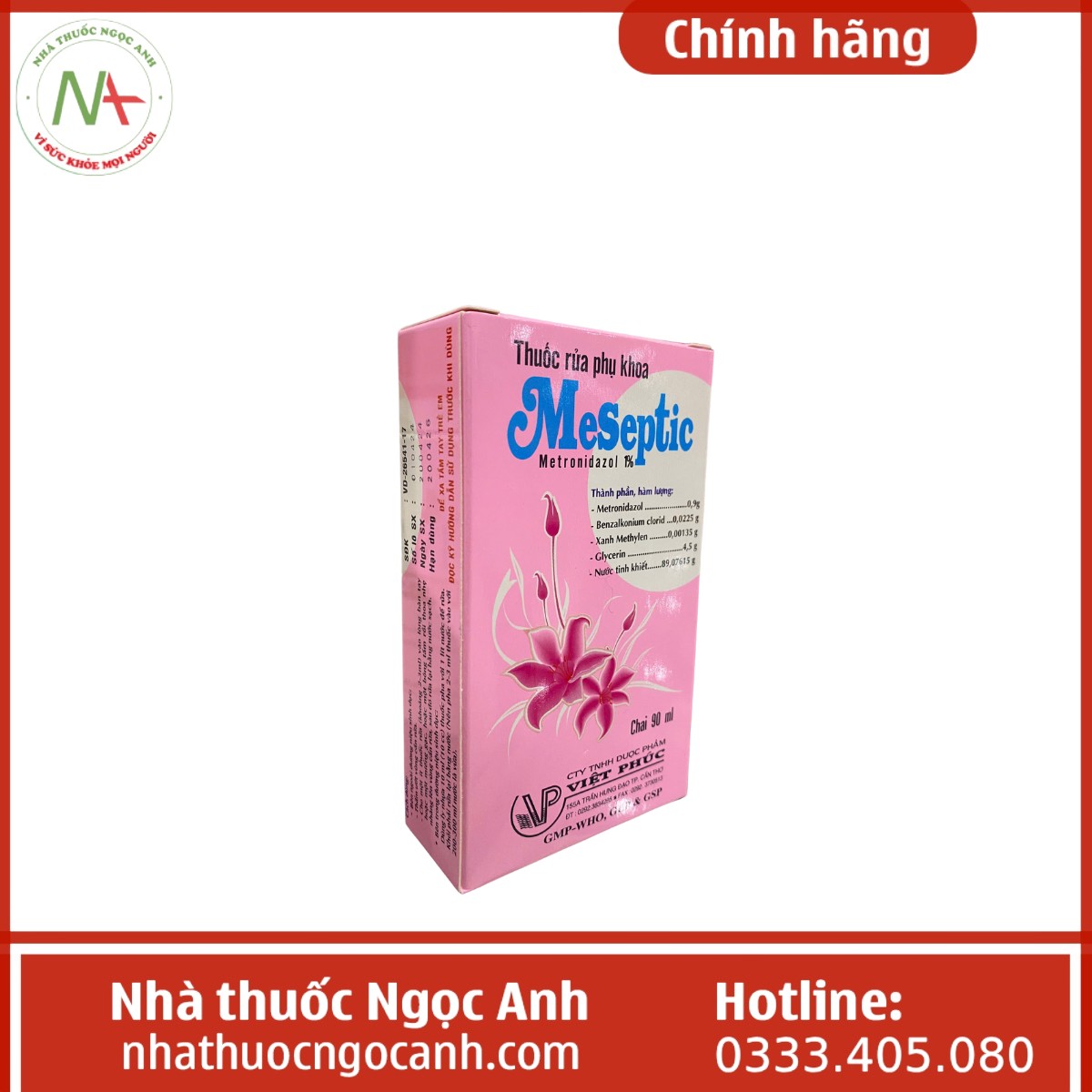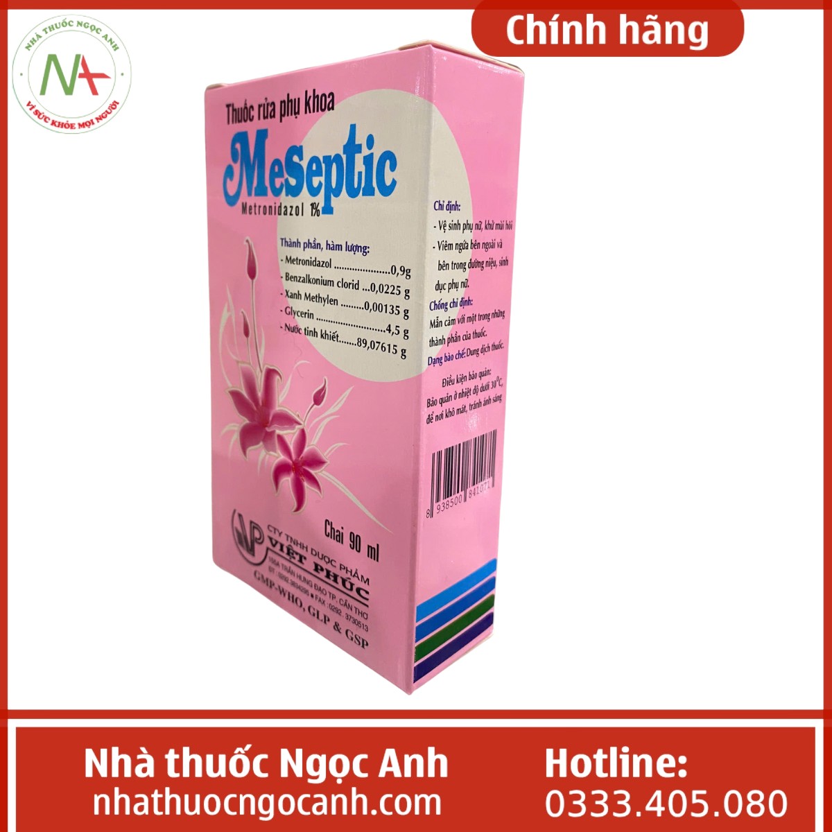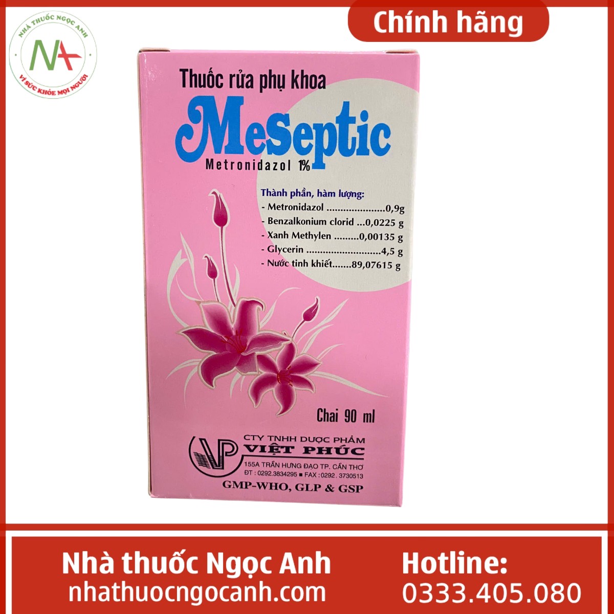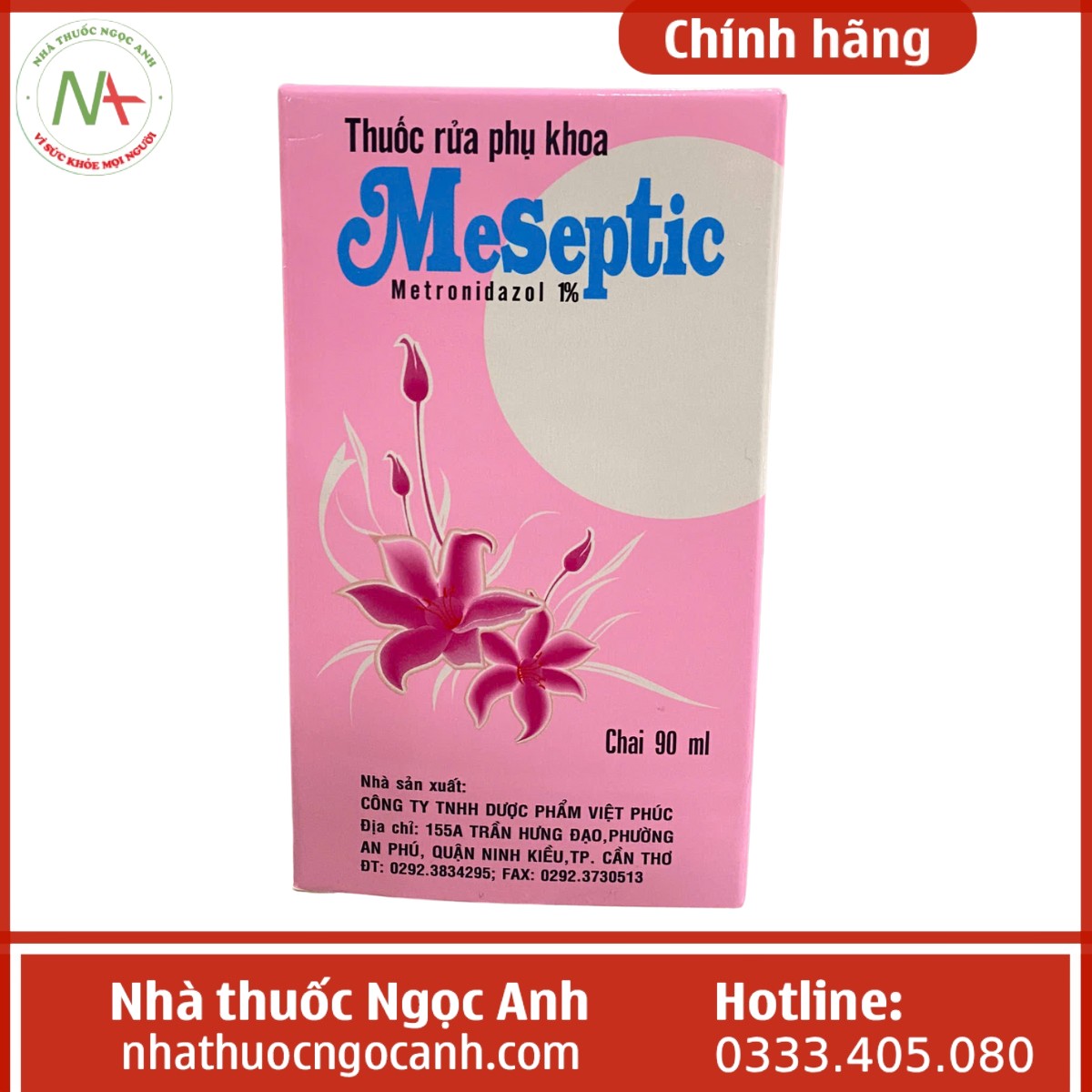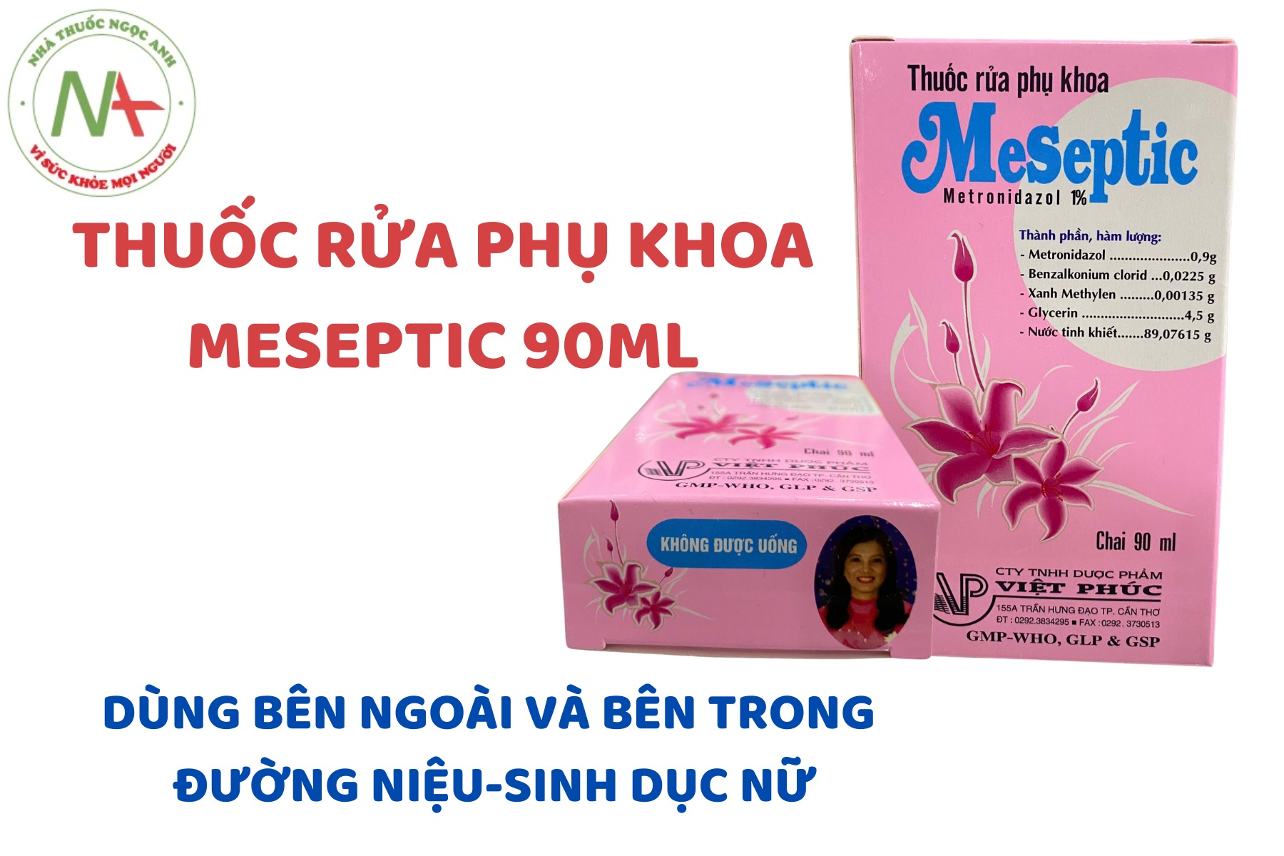 Thuốc thuốc rửa phụ khoa Meseptic 1% có chứa Metronidazol 1% được chỉ định trong: làm sạch, khử mùi hôi, vệ sinh phụ nữ. Dùng để giảm viêm, giảm ngứa bên ngoài và bên trong đường niệu và sinh dục phụ nữ.