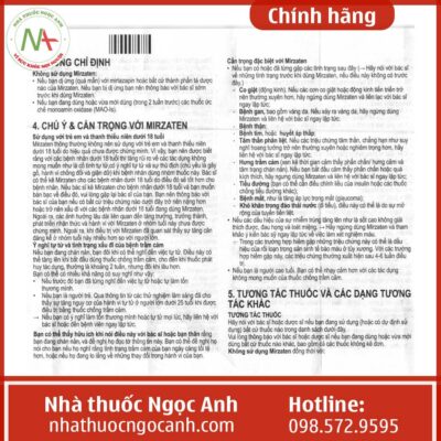 Thuốc Mirzaten 30mg đang được nhiều bác sĩ chỉ định trong các đơn thuốc điều trị bệnh trầm cảm. Để tìm hiểu đầy đủ hơn về công dụng, liều dùng, cách dùng và các lưu ý khi sử dụng thuốc Mirzaten 30mg mời các bạn cùng theo dõi bài viết dưới đây của Nhà thuốc Ngọc Anh.