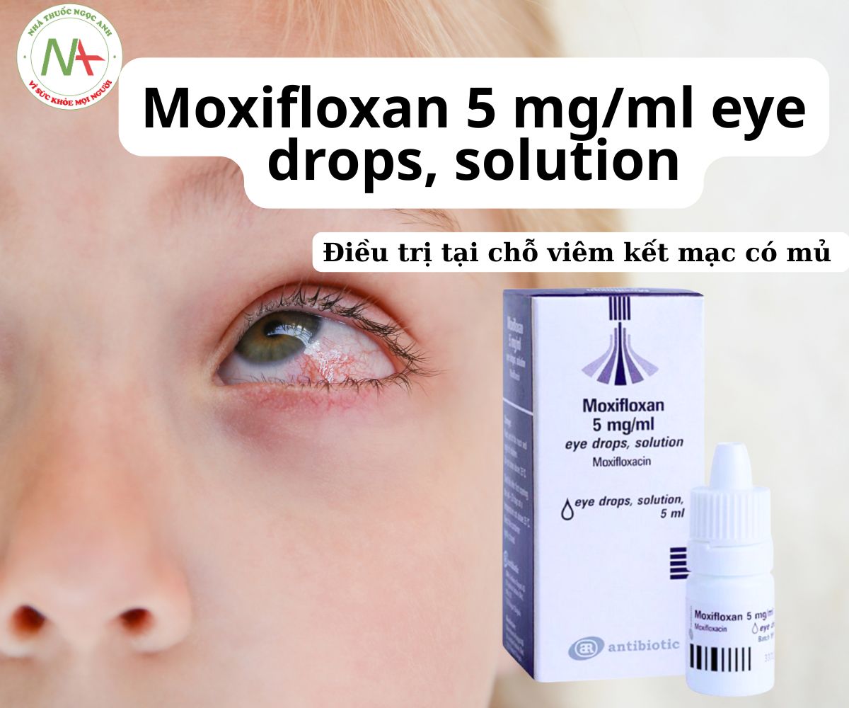 Moxifloxan 5 mg/ml eye drops, solution được chỉ định dùng trong điều trị tại chỗ viêm kết mạc có mủ do vi khuẩn nhạy cảm với moxifloxacin gây ra