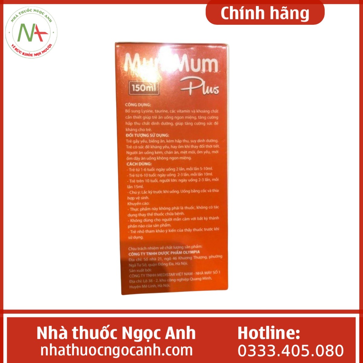 Với thành phần giàu dưỡng chất, siro Mum Mum Plus giúp trẻ ăn uống ngon miệng, hấp thu dinh dưỡng tốt hơn, đồng thời tăng cường sức đề kháng, giúp trẻ phát triển khỏe mạnh và toàn diện. Sản phẩm phù hợp cho trẻ em từ 1 tuổi trở lên, đặc biệt là những trẻ biếng ăn hoặc có nhu cầu bổ sung dinh dưỡng.