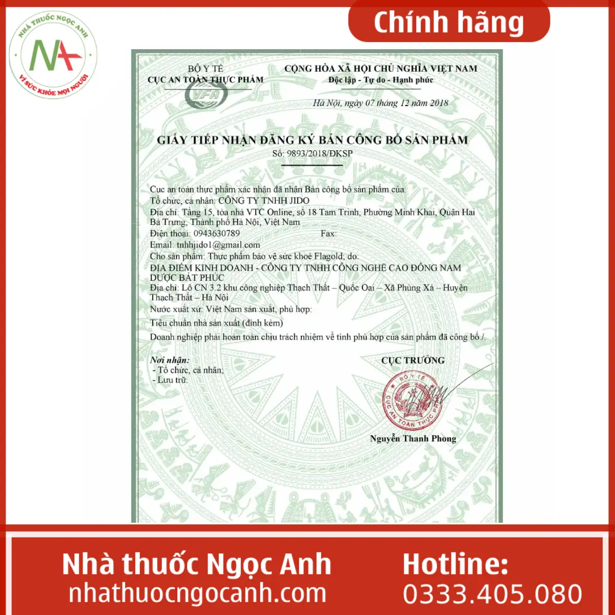 Viên uống Nano mầm đậu nành FlaGold là thực phẩm bổ sung nội tiết tố nữ đầu tiên tại Việt Nam ứng dụng công nghệ Nano được Trung tâm Công nghệ cao – Viện Hàn lâm Khoa học & Công nghệ Việt Nam khuyên dùng. Sản phẩm thuộc Công ty TNHH Jido (Jido Pharma)