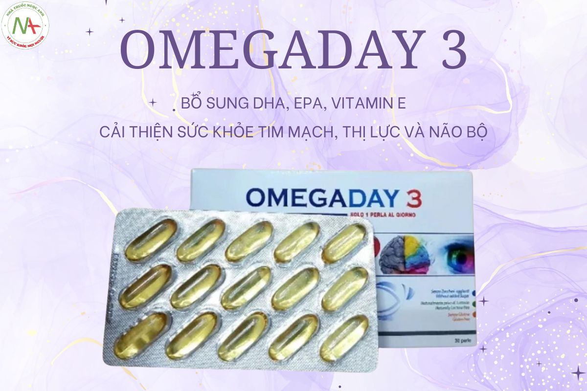 Omegaday 3 có công dụng bổ sung lượng DHA, EPA và vitamin E cần thiết cho cơ thể, hỗ trợ sức khỏe não bộ, cải thiện thị lực, tăng cường chức năng hệ tim mạch, chống oxy hóa