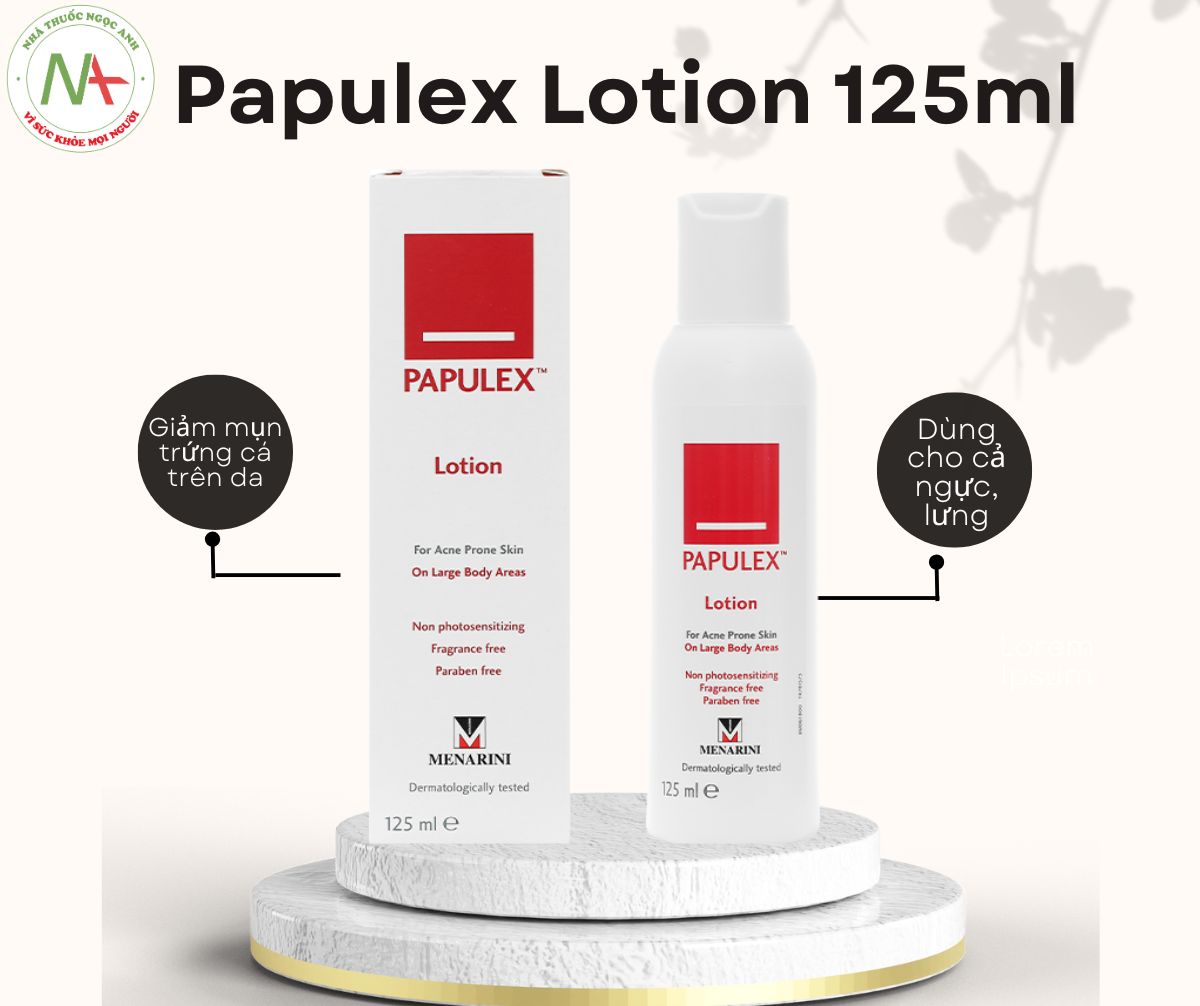 Papulex Lotion 125ml có tác dụng làm giảm mụn trứng cá trên da kể cả vùng ngực, lưng.