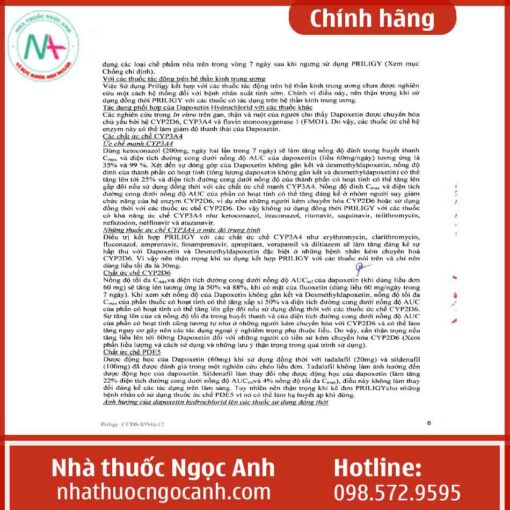 | Các thuốc ức chế CYP2D6 | Khi dùng Priligy 30mg đồng thời với các thuốc ức chế CYP2D6 làm nồng độ tối đa và diện tích đường cong dưới nồng độ AUC của Dapoxetine sẽ tăng lên lần lượt là 50% và 88%. |