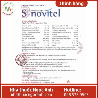 S – Novitel là thực phẩm chức năng, giúp bổ sung các loại vitamin, dưỡng chất ch bà bầu, giúp lấp đầy khoảng trống dinh dưỡng và ngăn ngừa những bất thường về phát triển khi sinh ra của thai nhi. Theo khuyến cáo tất cả phụ nữ mang thai nên bổ sung Vitamin, acid Folic và nhiều dưỡng chất cho cơ thể trước khi sinh.