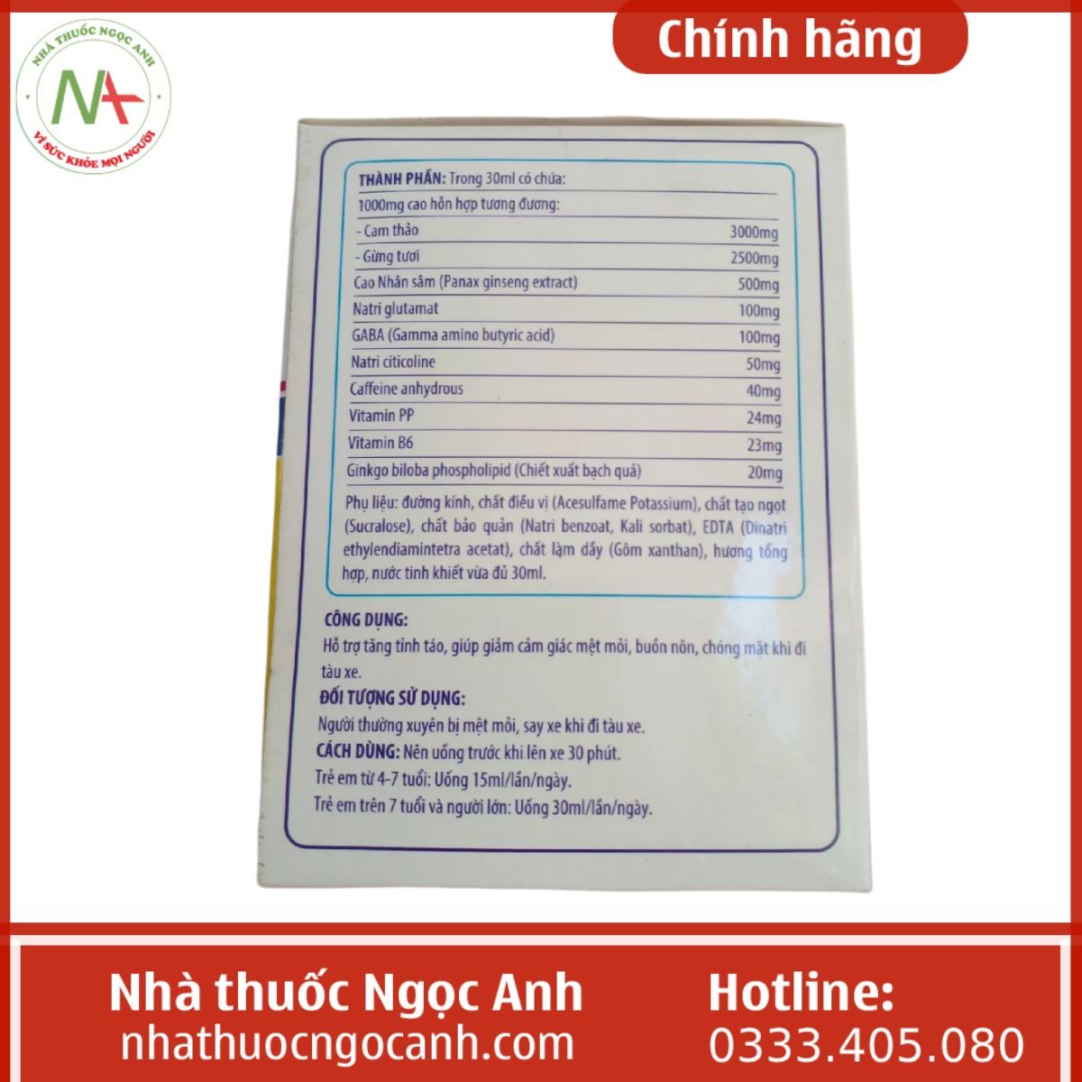 Nước chống say tàu xe DongSung Hàn Quốc được sản xuất tại DONGSUNG BIO PHARM.CO.,LTD., thành phần chứa vitamin B6, scopolamin, natri benzoat… Sản phẩm giúp làm giảm triệu chứng như hoa mắt, đau đầu, chóng mặt, yếu thần kinh.