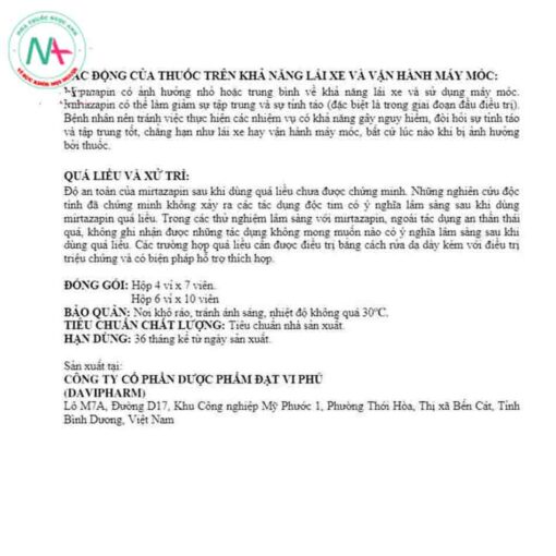 - Thành phần chính: Mirtazapine 30mg, tá dược vừa đủ 1 viên.
