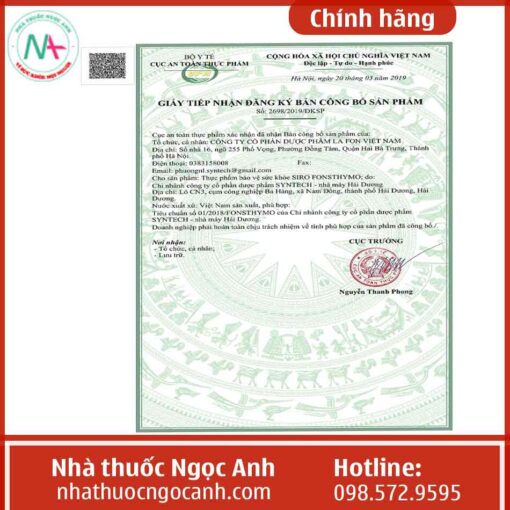 Siro Fonsthymo được đăng ký cấp phép sản xuất và phân phối bởi Công ty CP Dược phẩm LaFon Việt Nam với số đăng ký là 2698/2019/ĐKSP.