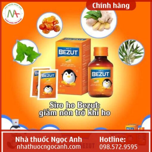 Siro ho bezut là gì? Siro ho Bezut được sản xuất bởi Công ty Cổ phần Dược phẩm Thiên Nhiên Việt, là sản phẩm bổ phế, giảm ho, làm ấm đường hô hấp, hỗ trợ giảm nôn, ói đặc biệt tốt cho trẻ nhỏ.
