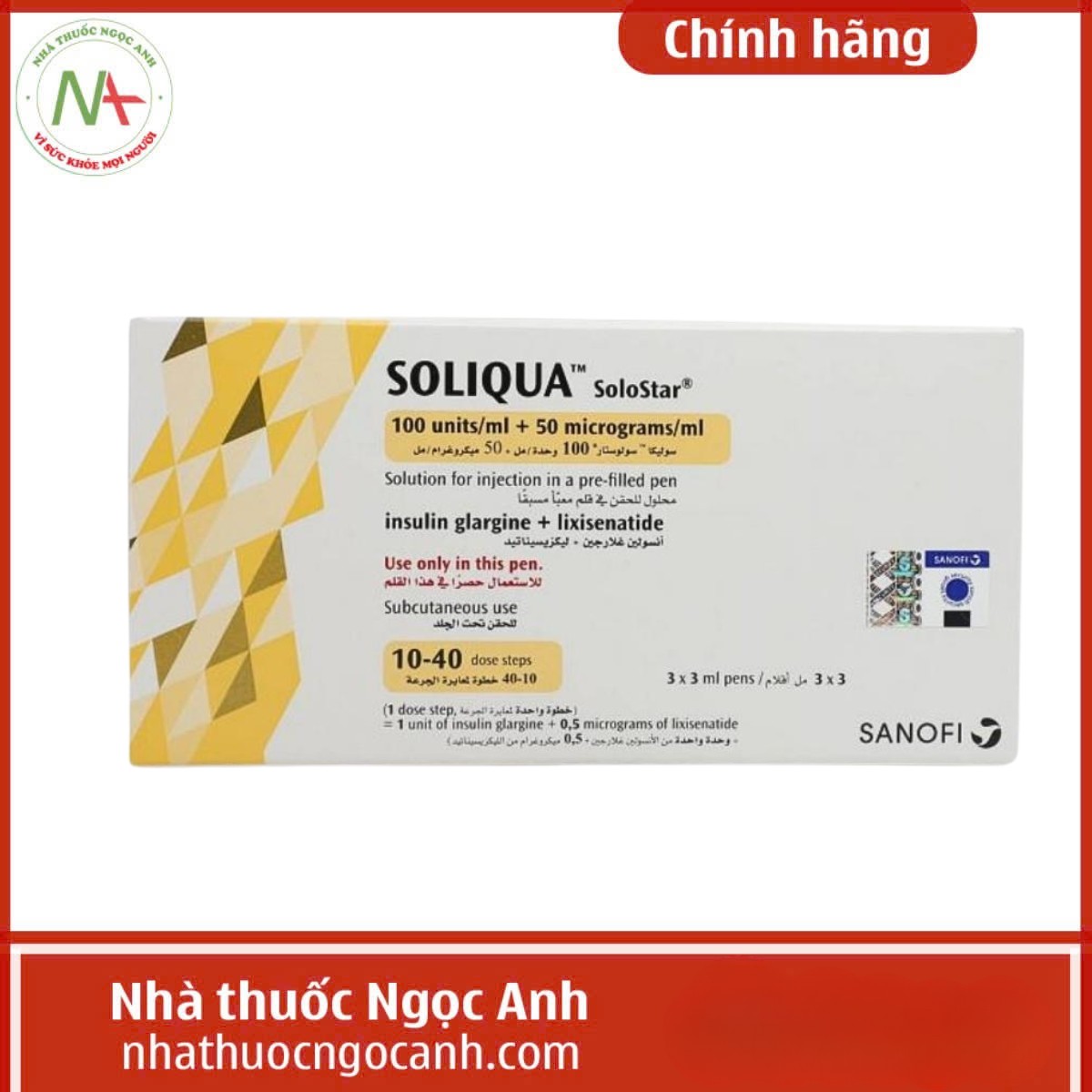 Bút tiêm Soliqua SoloStar được chỉ định để phối hợp cùng với Metformin trong liệu pháp điều trị cho người lớn mắc bệnh tiểu đường tuýp 2. Mục đích của việc sử dụng kết hợp này là để cải thiện khả năng kiểm soát mức đường huyết khi việc điều trị đơn độc bằng metformin, hoặc phối hợp metformin với một thuốc hạ đường huyết khác, hoặc thậm chí với insulin, không mang lại hiệu quả như mong đợi.