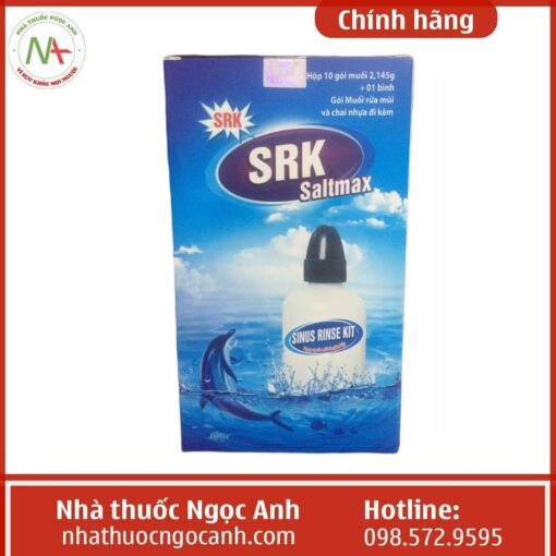 SRK Saltmax được bào chế dạng bột để pha dung dịch vệ sinh, được chỉ định trong các trường hợp vệ sinh mũi để phòng ngừa viêm mũi, viêm xoang; cảm cúm, chảy nước mũi, khô mũi dị ứng nghẹn mũi và dự phòng trong các trường hợp sau phẫu thuật mũi để tránh viêm mũi và viêm xoang