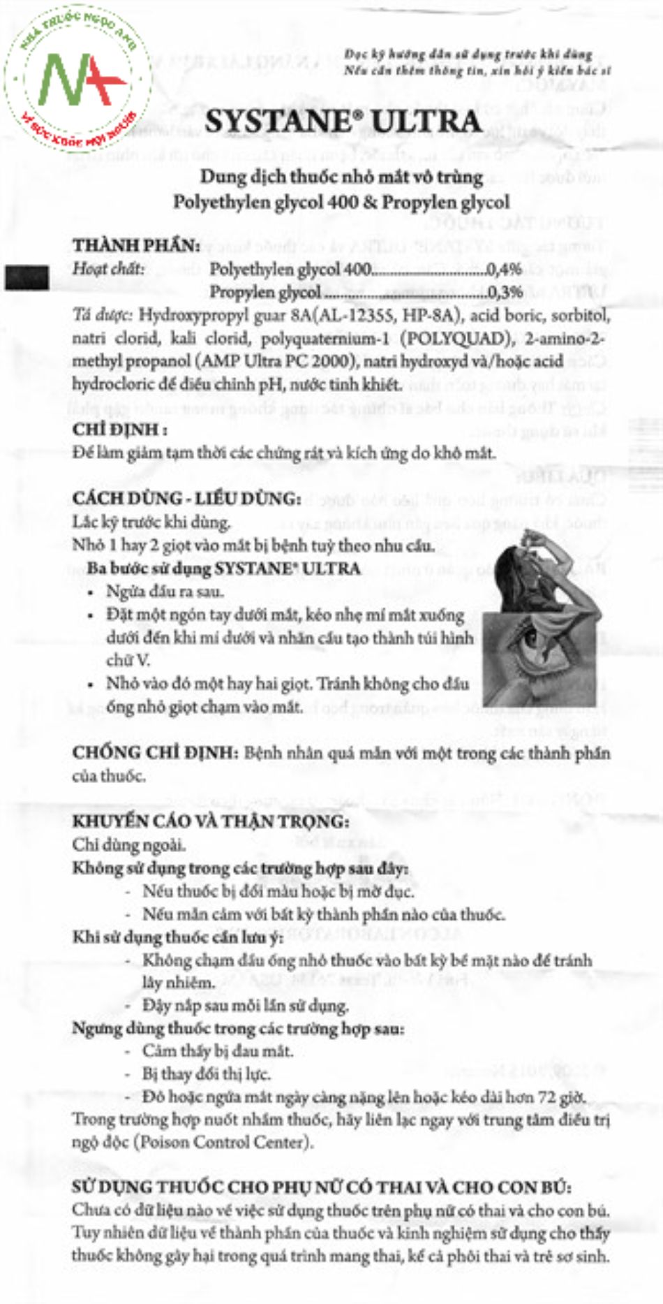 - Systane Ultra không vào tuần hoàn chung nên không gây các tác dụng phụ nguy hiểm toàn thân, quá liều không gây độc cho cơ thể.