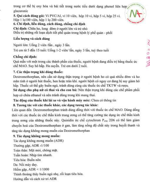 - Thuốc Dextromethorphan hấp thu rất nhanh qua đường tiêu hóa và có hiệu lực tác dụng trong vòng khoảng từ 15 đến 30 phút sau khi uống thuốc, hiệu tác dụng kéo dài từ 6-8 giờ. Thuốc được chuyển háo ở gan và bài tiết qua đường nước tiểu dưới dạng không biến đổi và có cả các chất chuyển hóa dạng demethyl, trong số đó có dextrorphan cũng có tác dụng giảm ho nhẹ.