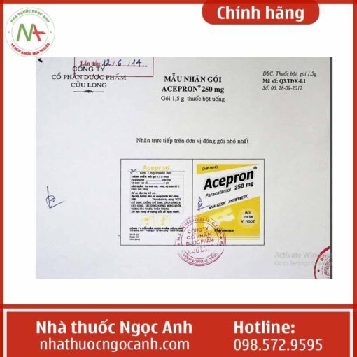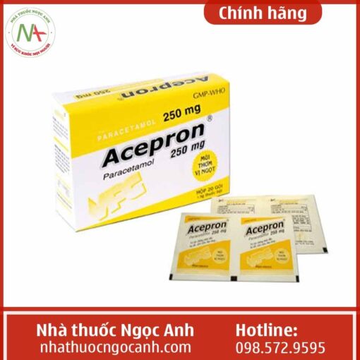 Acepron 250mg do Công ty cổ phần dược phẩm Cửu Long PHARIMEXCO và doanh nghiệp kê khai tại Việt Nam sản xuất và phân phối, hiên đang được bán tại nhà thuốc Ngọc Anh với giá khoảng 15.000vnđ cho 1 hộp gồm 20 gói, mỗi gói chứa 1,5g thuốc bột uống.