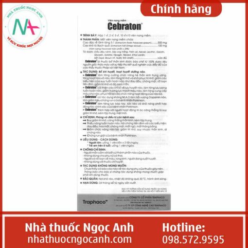 Một trong những vấn đề sức khỏe được quan tâm nhất hiện nay là sự phát triển khỏe mạnh và hoàn thiện của chức năng não bộ và hệ thống thần kinh. Để cải thiện các triệu chứng suy giảm hệ thần kinh, đã có nhiều các sản phẩm ra mắt, trong đó chất lượng và hiệu quả nhất không thể không biết đến thuốc Cebraton. Hãy cùng Nhà thuốc Ngọc Anh (nhathuocngocanh.com) tham khảo các thông tin về loại thuốc này trong bài viết dưới đây.