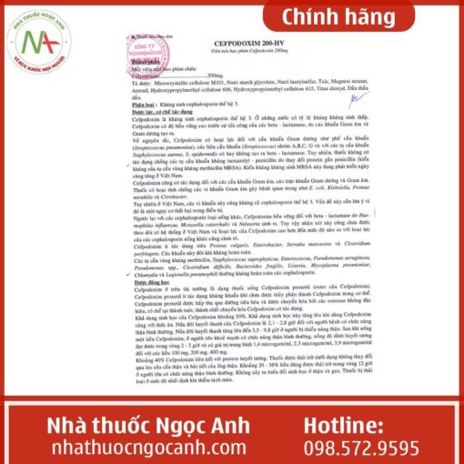 Trên thị trường hiện nay có rất nhiều thông tin về sản phẩm thuốc Cefpodoxim 200- HV tuy nhiên còn chưa đầy đủ. Bài này nhà thuốc Ngọc Anh xin được trả lời cho bạn các câu hỏi: Cefpodoxim 200 – HV là thuốc gì? Thuốc Cefpodoxim 200 – HV có tác dụng gì? Thuốc Cefpodoxim 200 – HV giá bao nhiêu? Dưới đây là thông tin chi tiết.