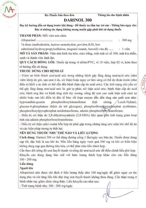 Tờ Hướng dẫn sử dụng thuốc Darinol 300. Để tải file PDF, hãy click Tại đây.