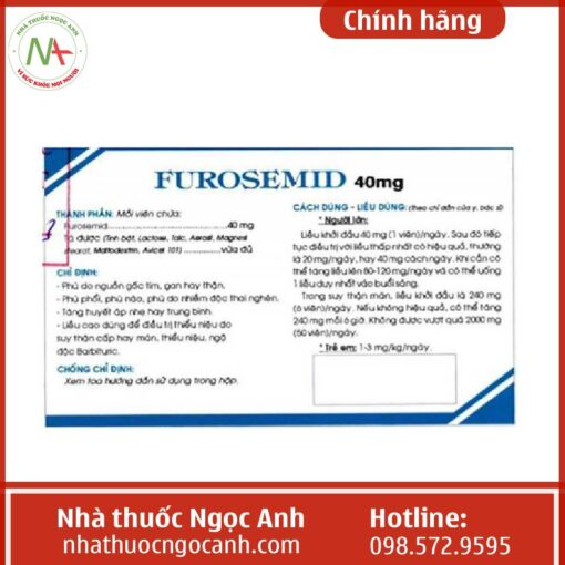 Thuốc Furosemid 40mg Traphaco được chỉ định cho các bệnh nhân bị phù do suy tim, hay xơ gan. Trong bài viết này, Nhà Thuốc Ngọc Anh (nhathuocngocanh.com) xin gửi đến bạn đọc những thông tin chi tiết về thuốc Furosemid.