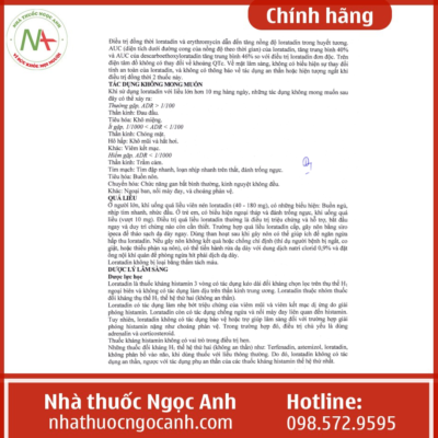 Nhưng trong trường hợp giải phóng histamin năng (choáng phản vệ) thì loratadine không có khả năng bảo vệ hay trợ giúp lâm sàng. Loratadine không phân bố vào não khi dùng liều thông thường, vì vậy nó không có tác dụng lên trung ương thần kinh, không có tác dụng an thần. Loratadine có khả năng gây tác dụng phụ thấp hơn các thuốc kháng histamin thuộc thế hệ thứ 2 khác.