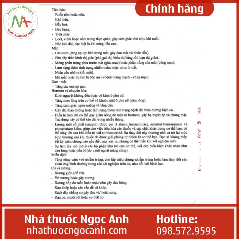 Chưa xác định được tần suất: nhiễm trùng cơ hội, viêm phúc mạc, tái phát lao tiềm ẩn, sarcom kaposi, tăng bạch cầu, quá mẫn do thuốc, suy tuyến yên, hội chứng ngưng steroid, nhiễm kiềm hạ kali huyết, giảm dung nạp glucose, nhiễm toan chuyển hóa, tăng thèm ăn, u mỡ ngoài màng cứng, tăng nhu cầu insulin hoặc các thuốc đái tháo đường đường uống, loạn thần, lú lẫn, mất ngủ, căng thẳng, cáu gắt, rối loạn tâm thần, co giật, mất trí, tăng áp lực nội sọ, chóng mặt, đau đầu, glaucom, mắt lồi, mỏng củng mạc, mỏng giác mạc, bệnh màng mạch – võng mạc, hoa mắt, suy tim sung huyết, vỡ cơ tim sau nhồi máu cơ tim, hạ huyết áp, huyết khối động mạch, thuyên tắc phổi, nấc, tăng enzyme gan, ban đỏ, ngứa, mề đay, xuất huyết, bầm máu, phát ban, rậm lông, rạn da, tăng tiết mồ hôi, giãn mao mạch dưới da, gãy xương bệnh lý, hoạt tử xương, teo cơ, bệnh cơ, đau khớp, bệnh khớp do thần kinh, kinh nguyệt không đều, mệt mỏi, khó chịu, triệu chứng ngưng thuốc – giảm liều corticosteroid quá nhanh sau khi sử dụng một thời gian dài sẽ dẫn đến suy tuyến thượng thận cấp, hạ huyết áp và tử vong, kinh nguyệt không đều.