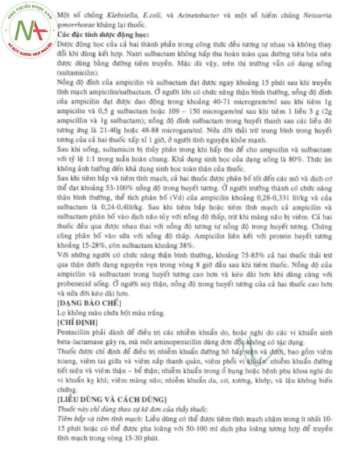 - Natri ampicilin và natri sulbactam (ampicilin/sulbactam) là một thuốc kết hợp cố định (tỷ lệ ampicilin/sulbactam là 2:1). Ampicilin là kháng sinh bán tổng hợp có phổ tác dụng rộng nhờ hoạt tính kháng khuẩn tác dụng trên nhiều vi khuẩn Gram dương và Gram âm do khả năng ức chế sinh tổng hợp mucopeptid trên thành tế bào vi khuẩn. Tuy nhiên, ampicilin bị enzym beta-lactamase phá hủy vòng beta-lactam, do thế binh thường phổ tác dụng không bao gồm những vi khuẩn tiết ra enzym này.