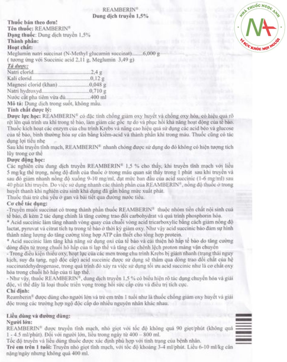 - Liều đối với người lớn: Tốc độ truyền thuốc không vượt quá 90 giọt trong vòng 1 phút ( tương đương với 4 đến 4,5 ml trong 1 phút), có thể sử dụng 1 đến 2 chai Reamberin 400ml trong 1 ngày.