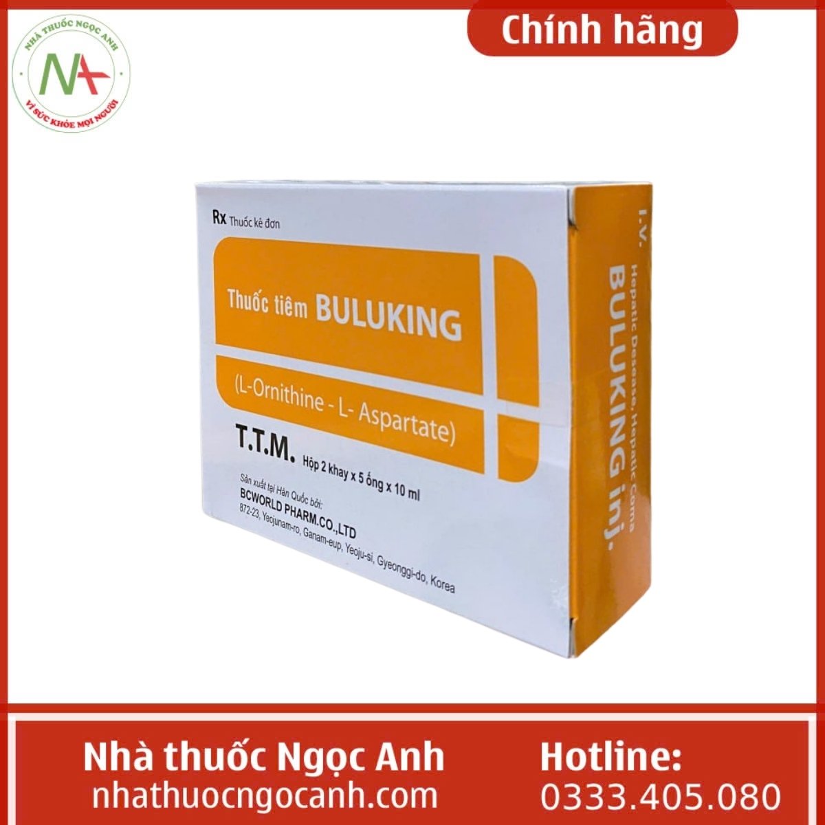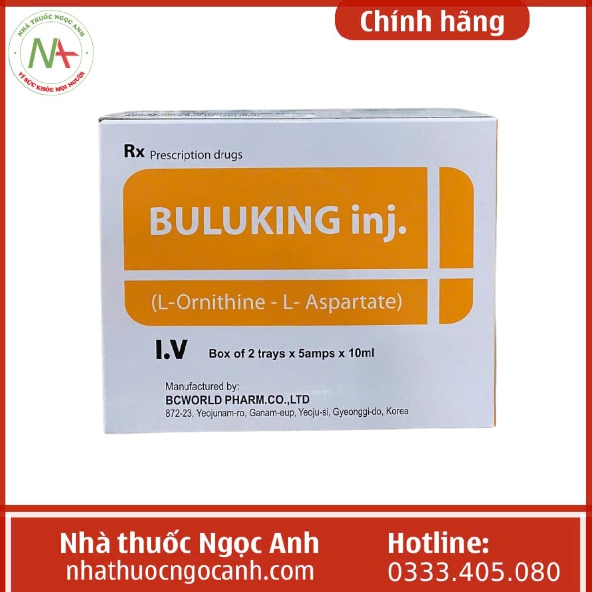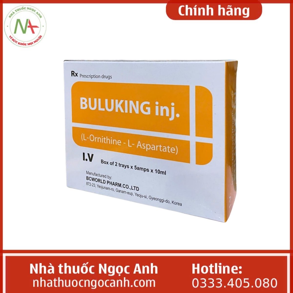 Có rất nhiều loại thuốc với các hoạt chất khác nhau có công dụng giúp điều trị các bệnh lý về gan. Trong đó thuốc Buluking chứa thành phần L-Ornithine-L-Aspartate có tác dụng điều trị cho những trường hợp đang bị viêm gan cấp, mạn tính,… Thuốc Buluking được bào chế ở dạng dung dịch tiêm và được đóng gói trong hộp 10 ống, mỗi ống dung tích 10ml. Được sản xuất bởi BCWorld Pharm.Co.,Ltd. Hàn Quốc và được đăng kí bởi Công ty TNHH Thương mại Dược phẩm Đông Phương và đăng kí lưu hành trên thị trường theo số đăng kí là VN-18525-14.
