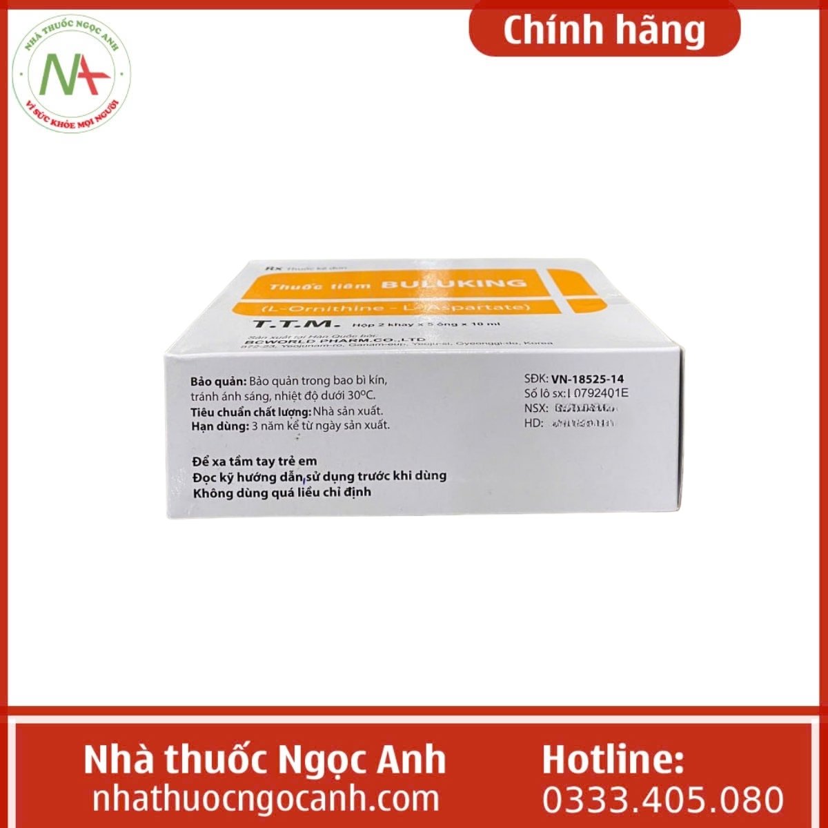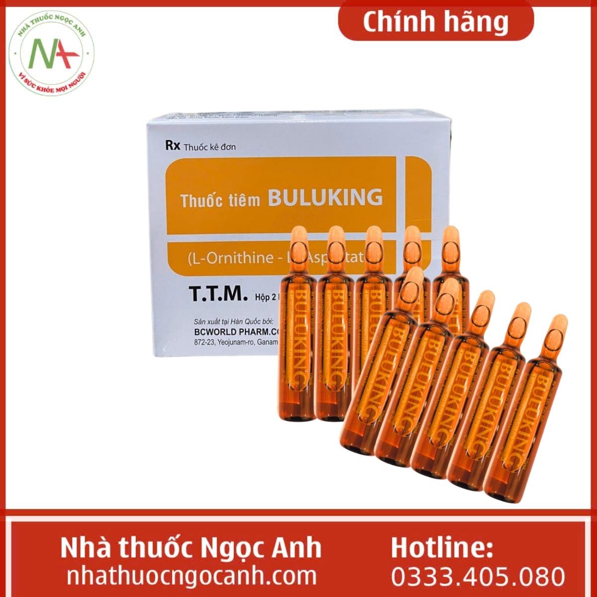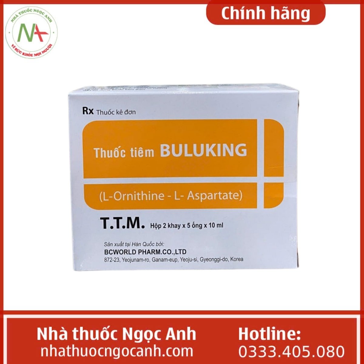 Có rất nhiều loại thuốc với các hoạt chất khác nhau có công dụng giúp điều trị các bệnh lý về gan. Trong đó thuốc Buluking chứa thành phần L-Ornithine-L-Aspartate có tác dụng điều trị cho những trường hợp đang bị viêm gan cấp, mạn tính,… Thuốc Buluking được bào chế ở dạng dung dịch tiêm và được đóng gói trong hộp 10 ống, mỗi ống dung tích 10ml. Được sản xuất bởi BCWorld Pharm.Co.,Ltd. Hàn Quốc và được đăng kí bởi Công ty TNHH Thương mại Dược phẩm Đông Phương và đăng kí lưu hành trên thị trường theo số đăng kí là VN-18525-14.