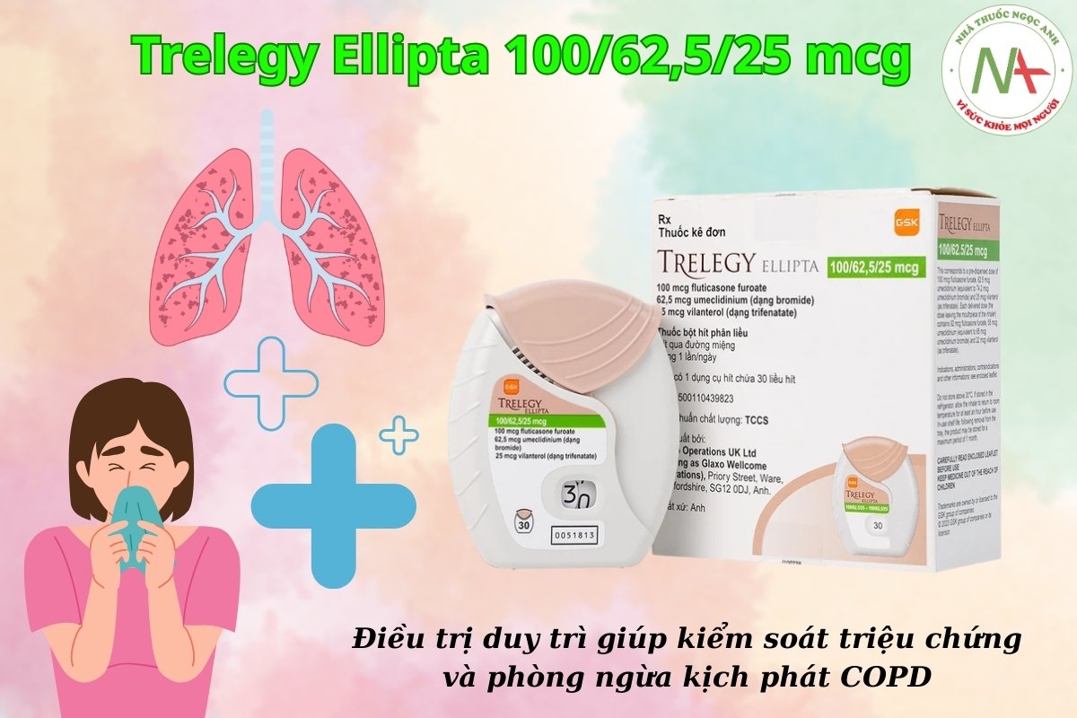 Bột hít phân liều Trelegy Ellipta 100/62,5/25 mcg được sử dụng trong điều trị duy trì nhằm kiểm soát triệu chứng và ngăn ngừa các đợt kịch phát ở bệnh nhân mắc bệnh phổi tắc nghẽn mạn tính (COPD).